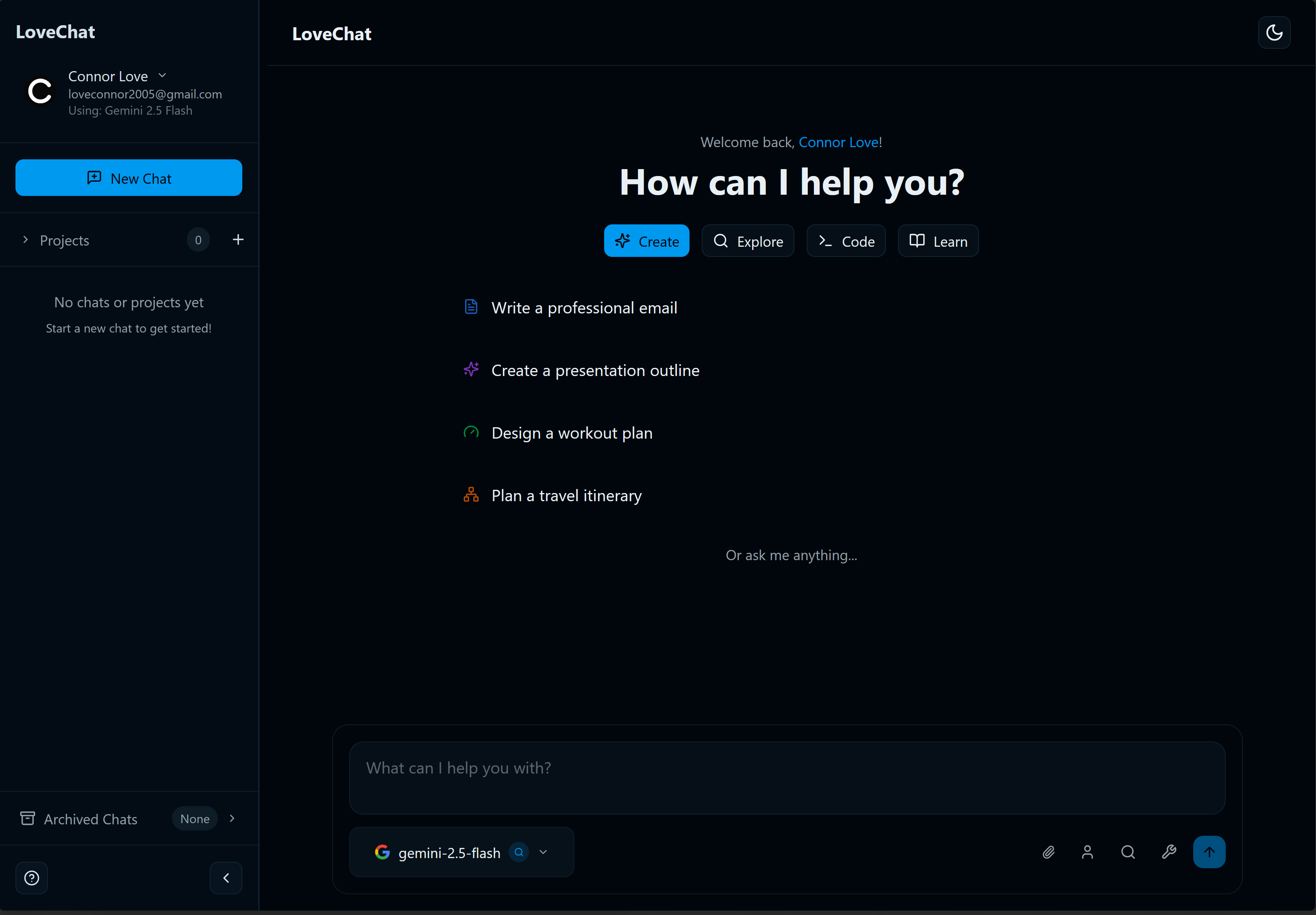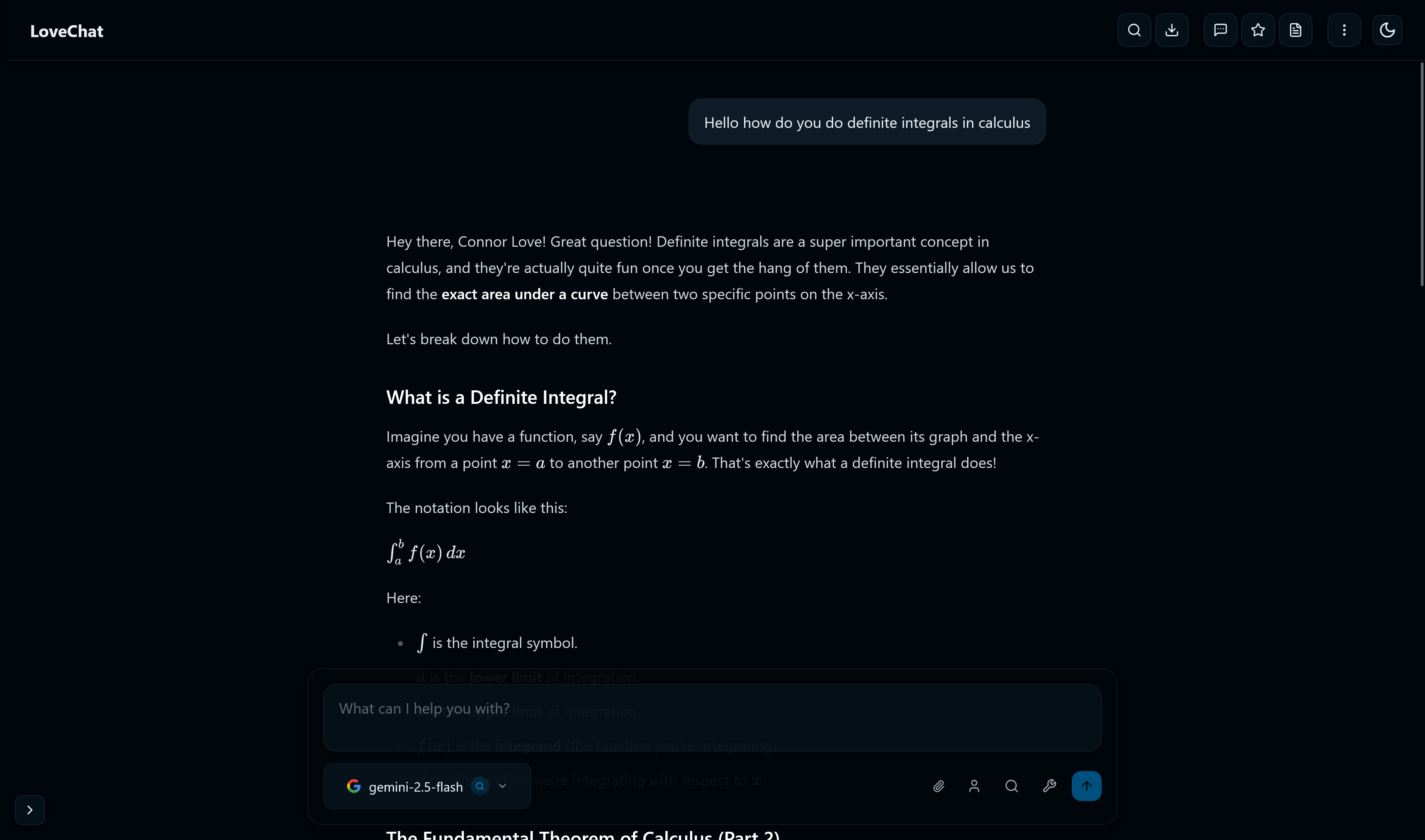 Building LoveChat gave me a playground to connect modern AI APIs with strong frontend design. Working solo meant handling everything: state management, backend auth, and orchestrating multiple providers. It cemented my skills in AI development and frontend scalability, and taught me how important seamless UX is for heavy‑duty AI tools.
